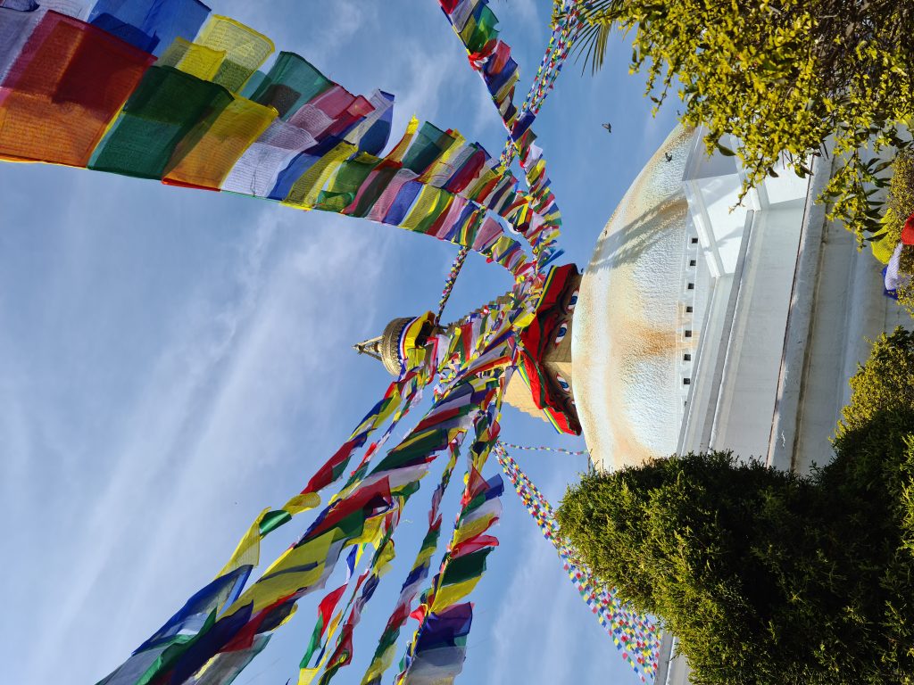 Endlich ist es wieder soweit, es ist der 4. März und ich lande in Kathmandu. Ich habe mich das ganze Jahr darauf gefreut, ich bekomme meinen Stempel in den Pass und darf einreisen. Vor dem Flughafengebäude wartet meine Freundin Chhiring. Wir haben uns letztes Jahr kennengelernt, uns verbindet so Einiges, und so waren wir das ganze Jahr in Kontakt via WhatsApp. Als Chhiring hörte, dass ich wieder komme, hat sie sich den Tag frei genommen, und so haben wir etwas Zeit für uns. Meinen Koffer bringe ich schnell ins Hotel, dann fahren wir weiter. Chhiring wohnt im Stadtteil Boudha, der von dem UNESCO Weltkulturerbe der Bodinath Stupa geprägt ist. Strahlend weiß und sehr erhaben ragt sie vor uns auf, ich bin immer wieder ganz ergriffen von diesem heiligen Gebäude. Wir schließen uns den vielen Pilgern an und laufen ein Mal im Uhrzeigersinn um die Stupa herum und zünden jede 3 Butterlampen im Inneren der Stupa an, dann biegen wir in eine der Gassen ab, die gar nicht mehr so ordentlich-touristisch sind, und verbringen ein paar schöne Stunden miteinander. Nachmittags falle ich dann ins Bett – ich bin seit 30 Stunden wach und schlafe fast bis zum nächsten Morgen durch.