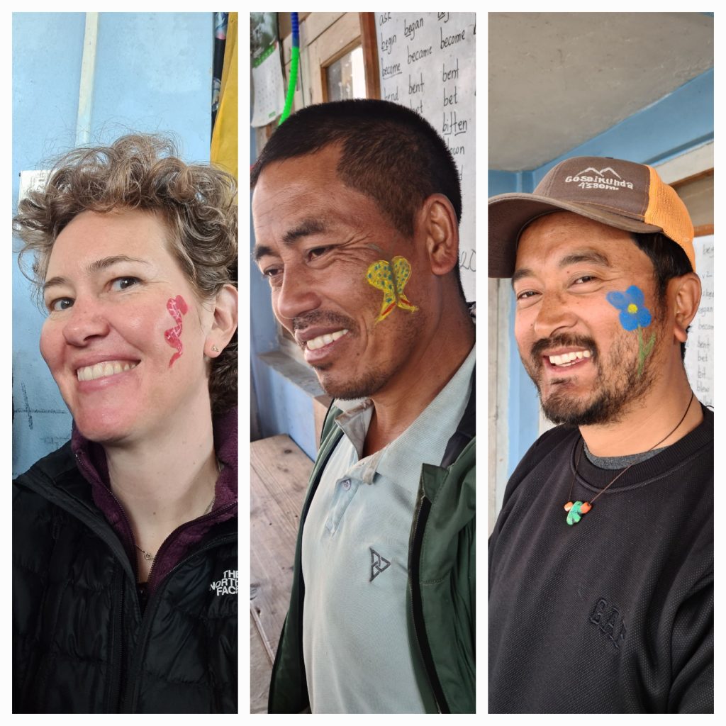 Ich hatte mir ja im letzten Bericht so hochtrabend vorgenommen, ab Montag „so richtig“ zu arbeiten, würde da aber gleich wieder ausgebremst von Nepal. Pläne machen ist hier nicht so… „Simone Sister, what do we do on Monday?“ „Uhm – you go to school!?“ „No, Monday is Holiday!“. – Schon wieder? Freitag war Feiertag, dann war Wochenende – und jetzt ist wieder Feiertag? Die Kinder finden’s natürlich super, also gut. Ich habe ja aus Deutschland Kinderschminke mitgebracht, was deutsche Kinder lieben können meine Nepali gar nicht doof finden. Also starte ich das Vorhaben „Projekttag“ und bitte um ein Glas Wasser am Montagvormittag. Ich bekomme sehr skeptische Blicke von Kami, aber das ist ok. Ich bitte das erste Kind in unser Lernzimmer. Es mòchte gern einen Schmetterling auf die Backe, einen Drachen verweigern ich. Mein Mal-Talen ist durchaus ausbaufähig und Drachen kann ich nicht. Aber der Schmetterling kommt gut an und und Tsering Dolma strahlt. Glücklich geht sie wieder raus zum spielen, vorbei an einer ganzen Menge staunender Kinderaugen, sowas haben sie noch nie gesehen! Aber es finden alle toll, und jetzt wird’s laut vor der Tür. Es wird wild diskutiert, was man alles so auf Backen malen kann, Tiger, Drachen oder ein schönes Mandala? Äh, nein. Ich male Schmetterlinge, Blumen oder Fische, ich lasse mich noch auf Schlangen ein, das war’s dann aber auch. Die Kinder sind zufrieden mit mir und strahlen um die Wette. Ihr bin über eine Stunde beschäftigt, Kinderbacken zu bepinseln, dann sind alle durch. Und plötzlich steht Pramod da, unser neuer Kinderhaus-Manager, er möchte bitte eine blaue Blume. Ich bin beeindruckt,näher voll, dass er sich nicht zu blöd ist für den Spaß gefällt mir sehr. Und hinten dran steht Dawa, bitte einen gelben Schmetterling. Huch!! Aber gern, für mich wird es dann eine rote Schlange. Die Kinder kreischen vor Begeisterung, und so schnappt sich Pramod den ganzen Haufen und geht noch ein wenig spazieren, das tut den Kindern wirklich gut. Am Ende des Tages sind die Kinder sehr glücklich und liegen alle mit sauber gewaschenen Gesichtern im Bett.
