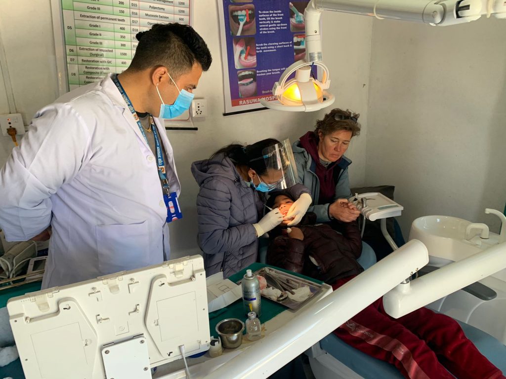 Der nächste Tag ist noch aufregender, vor allem für meine Kinder. Wir fahren mit 6 ausgewählten Kindern nach Dhunche ins Bezirkskrankenhaus zum Zahnarzt. „Simone Sister, I am going Dhunche?“ Ja, die schlimmsten Fälle sind heute dran, nächsten Freitag sind die übrigen Kinder vorgesehen. Der Jeep ist mit 6 Kindern und Fahrer nicht voll, aber auf dem Rückweg nehmen wir den HNO Arzt, einen Augenarzt sowie eine Ophtalmologin mit, sie sollen Hör- und Sehvermögen meiner Kinder überprüfen. Damit ist der Jeep dann wirklich voll, deshalb fahren Dawa und ich mit dem Motorrad nach Dhunche. Dort angekommen sieht mich die Zahnärztin schon von Weitem und winkt. Ja, ich erkenne sie auch von letztem Jahr, wir begrüßen uns herzlich und sie sprich sehr nett mit meinen Kindern. Dann gehen wir in den Behandlungsraum, sie stellt mir einen Stuhl an die gewohnte Stelle – am Kopfende, links, und wir fangen an. Ein Kind nach dem anderen bekommt Zähne gezogen und große Löcher gebohrt, ich bin ehrlich gesagt etwas entsetzt, wie schlecht die Zähne sind. Die Ärztin findet das aber normal und spricht an, was ich mit Dawa und Pramod bereits am Vortag diskutiert habe: der viele Zucker im Tee. Das wird bei uns im Kinderhaus reduziert, die Kinder bekommen jetzt auch gesalzenen Buttertee. Dieses Mal nützt das aber nichts, und so leide ich geschlagene 3 Stunden am Kopfende neben meinen Kindern, halte Hände und leide mit jedem Kind mit. Das ist ein Termin, der mir sehr wichtig ist, aber den ich gar nicht gerne wahrnehme. Als es geschafft ist dürfen die Kinder auch endlich was essen, dass sie sich in einem ‚Restaurant‘ aussuchen dürfen, was sie möchten, ist das Highlight schlechthin. Gestärkt fahren die Kinder wieder Richtung Khamjing, Dawa und ich setzen uns auf’s Motorrad. Unterwegs halten wir auf einer Farm an, unten am Fluss Trishuli, und machen Pause bei Wasser und Sprite. Hier sitzen wir zwischen steil aufragenden Felswänden, die die Sonne einfangen, an einem Pool und schauen auf Orangenbäume und Bananenpalmen und genießen die warme Sonne – bevor es weiter geht auf den Berg hoch. Auf 2200m Höhe bin ich dann wieder froh um meine Merinokleidung, die ich unter Jeans und Pulli trage!