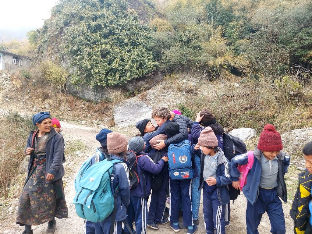 Die Fahrt nach Dhunche war sehr informativ, wir schaffen es, gleichzeitig mit den Kindern wieder in Khamjing zu sein. Ich habe kurz Zeit, mich etwas zu regenerieren, dann spiele ich mit den Kindern und freue mich, dass diese 15 nicht durch’s Raster gefallen sind sondern zur Schule gehen! Abends fragt Dawa mich, ob ich nach Nagthali möchte am Mittwoch? Donnerstag ist ja mein Abschlussessen, Freitag fahren wir nach Kathmandu, Samstag geht mein Flug. Ja, Frank hatte Nagthali mehrfach erwähnt, es soll dort sehr schön sein. ‚Is it very steep, Dawa?‘ ‚No, it’s Nepali flat, don’t worry. We will go tomorrow morning and be back in the evening.‘ Hm, aha, ich weiß ja nicht. Was ich gehört habe ist Nagthali doch etwas weiter, und ich kenne Dawas Zeiteinschätzungen mittlerweile recht gut. Schon in Deutschland habe mich mir für diese Fälle einen kleinen Ziploc Beutel mit meiner Notfallausrüstung zusammengestellt: Zahnbürste und kleine Zahnpasta, ein kleines Deo und – ich trage Kontaktlinsen, die nachts raus müssen – eine kleine Kochsalzlösung und Döschen zur Aufbewahrung. Das packe ich am nächsten Morgen ein, außerdem den Hüttenschlafsack, wer weiß, wo ich so lande. ‚You only need small backpack, only waterbottle!‘ Ja. Und mein Notfallpack. ‚We will leave at 9am‘ Dann soll ich doch noch die Kinder zur Schule bringen, 10h reicht dicke. Und um 10h fängt Kami an zu kochen, wir kommen so kurz nach 11h los. Um 18h wird’s dunkel. Pramod sagte, man fährt ca. 3 Stunden bis zum Parkplatz, ab da läuft man nochmal 45min (ich verdopple diese Zeitangabe, ich bin kein Nepali). Das ganze mal 2 – wir wollen ja zurück kommen – da bin ich bei 9 Stunden. Als wir aufbrechen vergewissere ich mich, dass mein Ziploc Beutel in meinem kleinen (!) Rucksack ist und freue mich auf die Fahrt. Es geht den Berg runter, auf der anderen Seite wieder hoch, wir biegen dann rechts ab und ich erkenne alles wieder. ‚This is where we bought the chicken last year, right? And this is the home from Sarmila! This is where we visited her family!‘. Schließlich halten wir nach ca 2h an. Hier wohnen die Eltern von Priya, 2. Klasse. Ich freue mich, sie wieder zu sehen, und gehe runter zu ihrem Haus. ‚And now?‘ ‚Just say hello‘ Es ist fast 13h, im Leben sagen wir nicht einfach nur Hallo. Und da kommt auch schon die Frage, ob ich Hunger habe, Priyas Mutter möchte mir gerne ein Dal Bhat machen. Ich schaue Dawa an, ob er Hunger hat? Och nö, außerdem wurde ich ja gefragt, ihm ist das sehr egal. ‚OK, sure. No, thanks Dear, I am not hungry, just a tea and we can go, no lunch needed.‘ Dawa schaut ganz entsetzt und ich muss lachen! Natürlich hat er Hunger, und wir haben hier auch nicht zufällig angehalten, er hat hier eine kalkulierte Mittagspause eingelegt. Also schaue ich Priyas Mutter an, die von unserem englischen Gespräch nichts verstanden hat, nicke und bedanke mich für die Einladung. Dawa ist erleichtert.