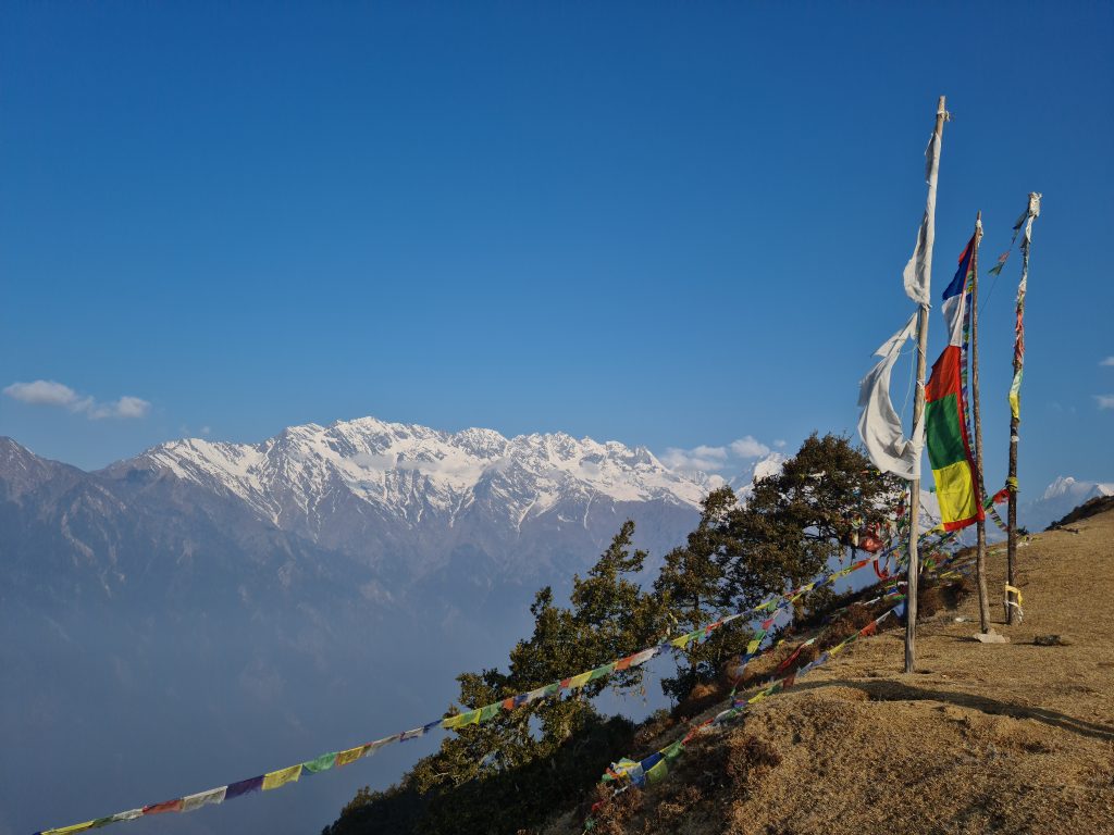 Am nächsten Morgen klopft Dawa sehr früh ‚Get up, the sun is shining!‘ Und tatsächlich, auf der anderen Seite ist der Langtang Lirung zu sehen, der Himmel ist blau und ich sehe die einzigartige Kulisse dieses Hochplateaus. Nur über Tibet hängen schon die Wolken, schade. Nach einem schnellen Tee laufen wir eine Runde, und ich freue mich sehr, dass Dawa mich hierher gebracht hat, es ist wirklich schön. Zwischen einem Rhododendron-Wäldchen und einer Dzo-Herde genieße ich die Ausblicke auf den Ganesh Himal, bevor es zurück geht für ein Frühstück. Danach steigen wir wieder ab, langsam zieht sich auch der Himmel wieder zu.