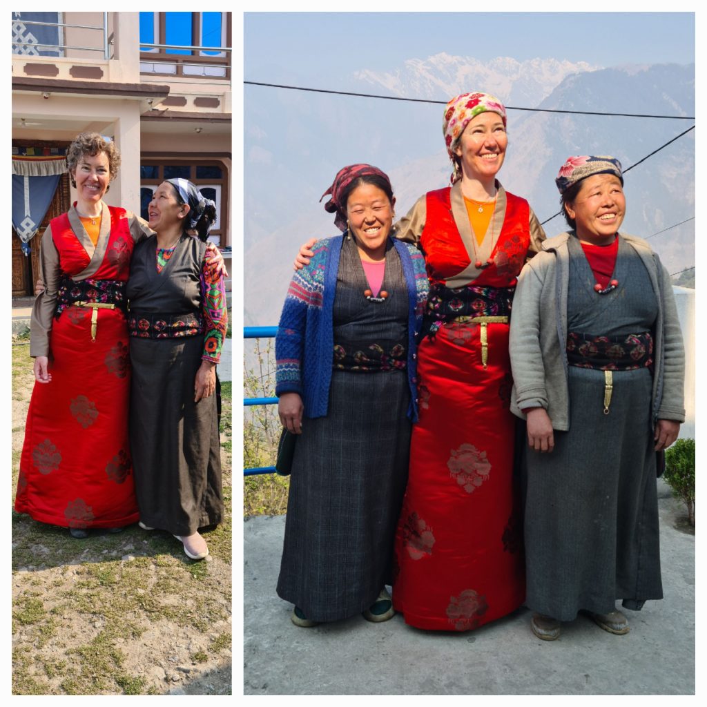 Nach der Aufregung am Wochenende ist der Montag erstmal ein ruhiger Tag. Nachdem ich die Kinder auf dem Schulweg begleitet habe – ‚half way‘, wie auch letztes Jahr, den Anstieg vor der Schule spare ich mir – komme ich zurück ins Kinderhaus und trinke meinen Tee mit Kami, draußen in der Sonne. Dann sagt sie ‚Picture Bakhu?‘ Ich habe mir ja eine Bakhu, also ein traditionelles Kleid aus der Gegend hier, schneidern lassen, aus leuchtend rotem Seidenstoff, und wir wollten ein Foto machen, mit mir in Bakhu. Aus irgendeinem Grund amüsiert es alle Nepali zutiefst, dass ich nun stolze Besitzerin dieser Tracht bin, und ein Foto mit mir in Tracht ist heiß begehrt. Also springe ich in mein Zimmer und versuche, mich anzuziehen, das ist gar nicht so einfach. Das Kleid wird innen gebunden, außen geknöpft, dann geschnürt, hinten kommt eine Filzschürze drüber, die von einem eng gewickelten Wollgürtel fixiert und schließlich mit einem Schmuckgürtel aus Messing mithilfe von zwei sehr spitzen Haken gehalten wird. Filzschürze und Wollgürtel habe ich letztes Jahr schon als Abschiedsgeschenk von Kami erhalten und dieses Jahr wieder mitgebracht, jetzt habe ich alles auf dem Bett ausgebreitet und mühe mich etwas ab, aber irgendwie komme ich doch überall rein und kann es ordnungsgemäß schließen. Ich laufe wieder runter, zuerst zu Pasang, meiner Wirtin. Die freut sich sehr, als sie mich in Tracht sieht, und kommt sofort für ein Foto aus ihrer Küche. Dawa biegt um die Ecke, strahlt mich an und findet, das sieht gut aus so. Ich drücke ihm mein Handy in die Hand, einer muss ja die Fotos machen. Nach Pasang gehe ich runter zu Kami und Pasang 2, Dawa im Schlepptau. Für die Fotos. Kami guckt mich kritisch an, dann verschwindet sie. Ich schaue Dawa an ‚Not good??‘ Er schaut bemüht freundlich ‚Well, Simone – your head‘. Ja, ich habe keine Kopfbedeckung, will die aber auch nicht. Läuse sind hier die fast am weitesten verbreiteten Haustiere… Kami kommt wieder mit einem Tuch, das ich mir um den Kopf binden soll. Auf der anderen Talseite, bei den Tamang, haben die Frauen wenigstens einen schön bestickten Hut auf, bei uns tragen Frauen Kopftuch. Ich füge mich, ich möchte Kami nicht verletzen, finde aber, das Tuch gibt mir ein ziemlich trutschiges Aussehen. Ich find’s echt doof. Allerdings stehe ich mich meiner Meinung alleine da, jetzt erst gucken Dawa und Kami sehr zufrieden. ‚Now I can find you a good Nepali husband, you look great!‘ Ja, danke, will ich nicht. Aber das Foto machen wir, ich find’s toll, mit Kami und Pasang 2, und haben wirklich Spaß. Ich bleibe noch ein wenig in Bakhu, und alle Nachbarn, die vorbeischauen, sind völlig aus dem Häuschen, dass ‚die Weiße‘ doch tatsächlich Bakhu trägt. Kommt wohl nicht so oft vor.