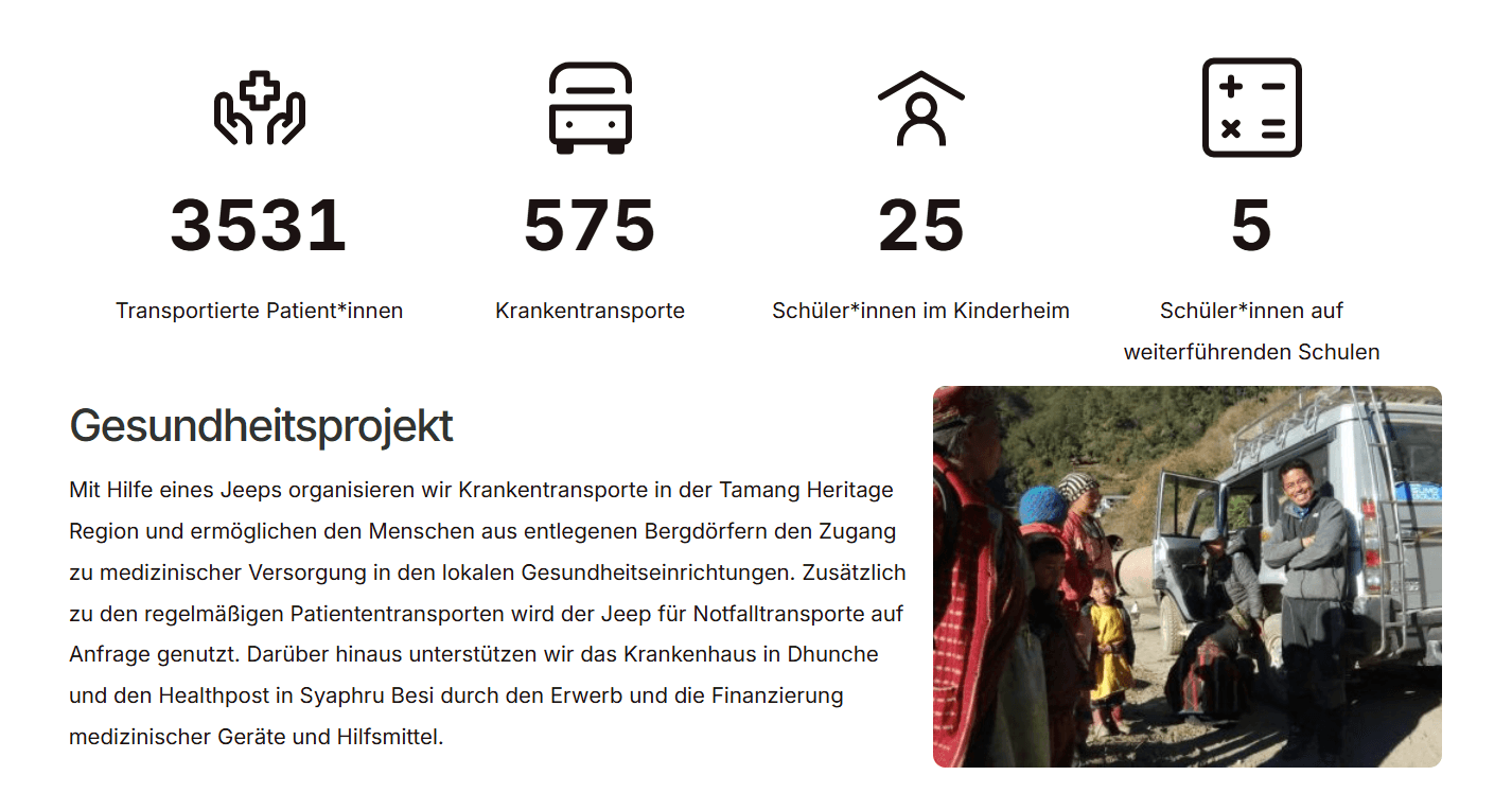 In Zukunft möchten wir Euch noch mehr Zahlen und Fakten zu unseren Projekten darstellen und haben bereits mit den ersten Daten zum Gesundheits- und zum Bildungsprojekt begonnen. In den nächsten Wochen dürft Ihr Euch auf den Jahresbericht und den aktualisierten Transparenzbericht freuen.