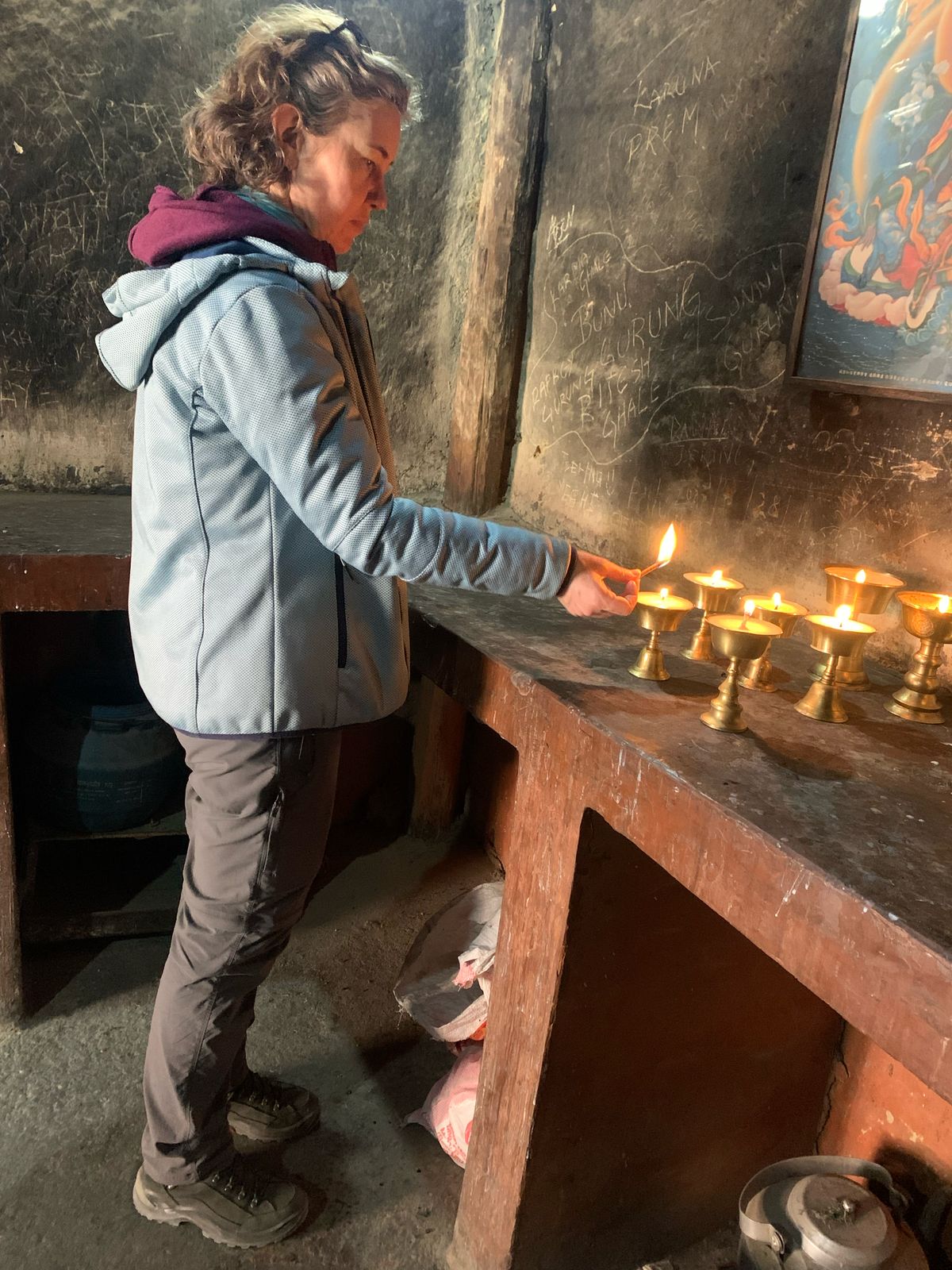 We walk around the lake, then we get on the motorcycle and drive to the monastery. I have already seen some old Buddhist monasteries in the Himalayas, and more will follow. They are just as similar as Christian churches. I enjoy every visit and delight in the ever-present smell of butter lamps, smoke, and age. It is beautiful here; we light three butter lamps each (always an odd number, 7 would be best, but 3 is good) and I give the Lama who opened the monastery for us a small fee. When lighting the butter lamps, one must be careful not to breathe over the flames, as it brings misfortune. And above all, one must not blow out the long candle used to light the lamps, I have already learned this and am very diligent in trying to remember and not act on reflex.